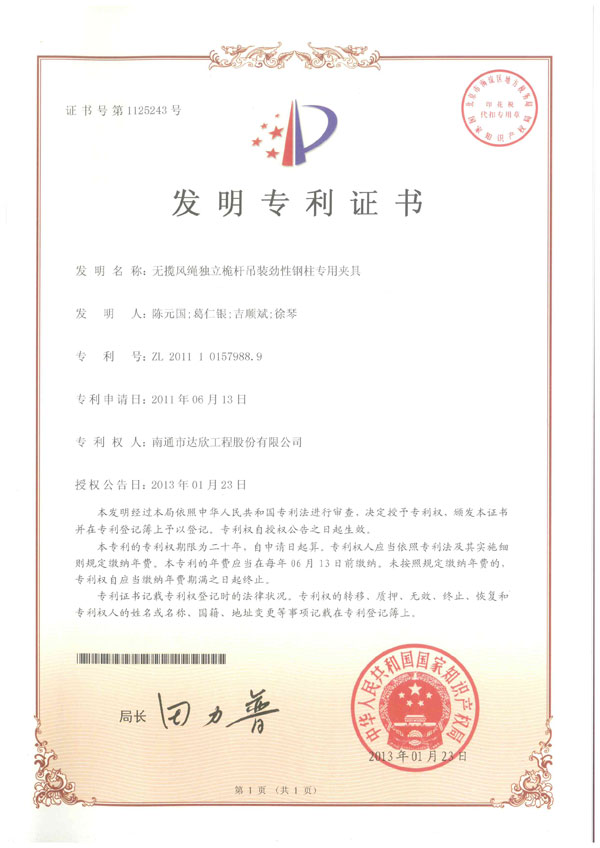 國(guó)家知識(shí)產(chǎn)權(quán)局對(duì)我公司申報(bào)的專利成果“無(wú)攬風(fēng)繩獨(dú)立桅桿吊裝勁性鋼柱專用夾具”,授予了發(fā)明型專利證書(shū),這是我公司首次獲得此類型專利,標(biāo)志著公司專利成果的水平躍上新的臺(tái)階。
