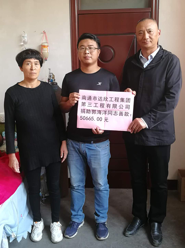 第三工程公司黨支部書(shū)記陳仁富經(jīng)常:“愛(ài)心無(wú)小事,樂(lè)善好施,扶貧幫困”是達(dá)欣人的傳統(tǒng)美德。在知曉情況后,立即發(fā)出愛(ài)心倡議。黨員們積極帶頭,全體員工紛紛伸出充滿(mǎn)愛(ài)心之手,將50665元善款在第一時(shí)間送到郭海洋及家人手里。