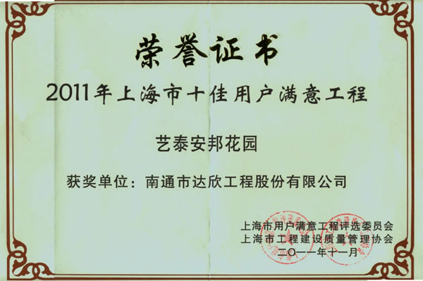 上海市“十佳用戶滿意工程”是上海市建筑業(yè)重量級獎項,是上海市在建的大型工程中,通過業(yè)主等部門使用后,選出十五項質量優(yōu)秀、后期運行穩(wěn)定、服務質量優(yōu)秀的工程為候選單位,并在十五項候選工程中選出十項通過專家評審,方可獲得上海市“十佳用戶滿意工程”獎。獲此獎項標志著達欣公司進滬施工的信譽和業(yè)績提高到了一個更高層次,必將對持續(xù)經(jīng)營開發(fā)起到良好的社會影響。