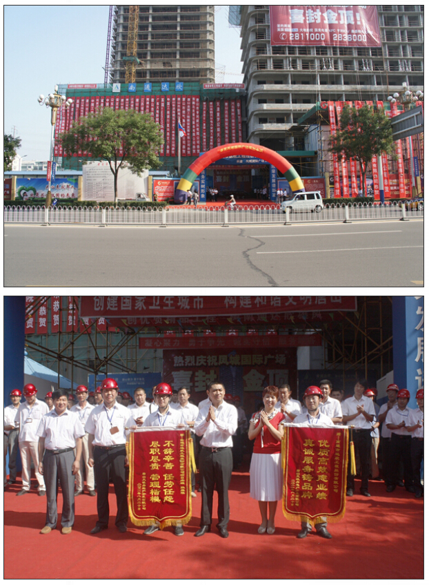 封頂儀式上,天壤地產(chǎn)闞春鳳董事長、魯寧總經(jīng)理向項(xiàng)目施工單位、合作單位對(duì)于本項(xiàng)目的支持配合及付出的辛勤勞動(dòng)表示了誠摯的感謝,給達(dá)欣公司頒發(fā)了“優(yōu)質(zhì)高效建業(yè)績,真誠服務(wù)鑄品牌”的錦旗,給項(xiàng)目經(jīng)理張維琪頒發(fā)了“不辭辛苦、任勞任怨,盡職盡責(zé)、管理楷?!钡腻\旗,以肯定和表彰我公司在鳳城國際廣場工程施工中所做出的成績。同時(shí)也希望大家繼續(xù)發(fā)揚(yáng)拼搏創(chuàng)新的精神,為天壤的發(fā)展和唐山的經(jīng)濟(jì)建設(shè)做出貢獻(xiàn)。