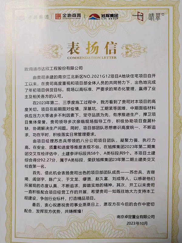 近日,公司收到南京卓定置業(yè)有限公司發(fā)來的表揚(yáng)信,對(duì)公司南京G12項(xiàng)目管理團(tuán)隊(duì)出色完成年初項(xiàng)目預(yù)期目標(biāo),以及在項(xiàng)目建設(shè)中表現(xiàn)出的專業(yè)、認(rèn)真、負(fù)責(zé)的態(tài)度,不畏困難、迎難而上的精神,高標(biāo)準(zhǔn)、嚴(yán)要求的工作作風(fēng)提出贊揚(yáng)和認(rèn)可。此外,該項(xiàng)目在旭輝集團(tuán)2023年第二期土建類檢查中榮獲第一名的好成績(jī)。