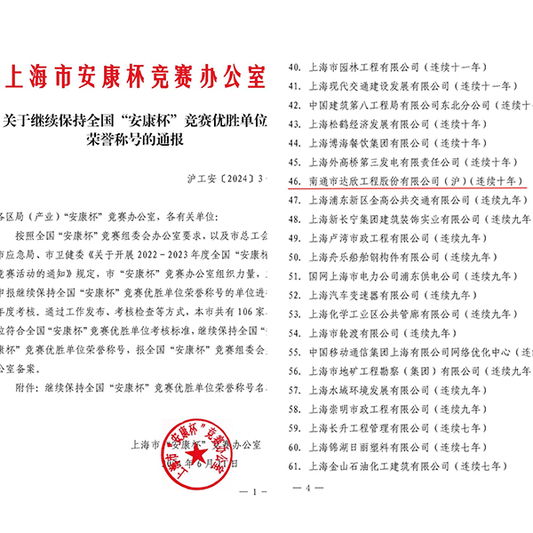 日前,上海市“安康杯”競賽辦公室滬工安【2024】3號文件,對獲得2022-2023年全國“安康杯”競賽優(yōu)勝單位榮譽(yù)的集體進(jìn)行通報(bào),達(dá)欣集團(tuán)連續(xù)十年被評為全國“安康杯”競賽優(yōu)勝單位。