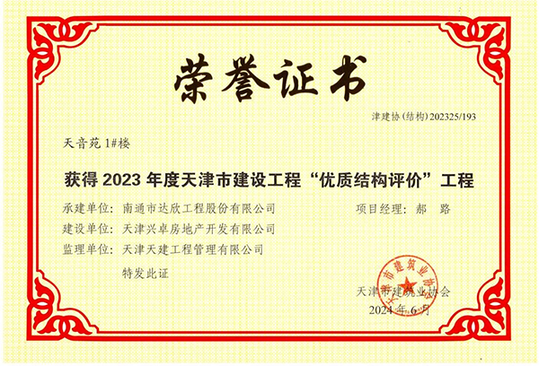 近日,由第六工程公司承建的天音苑1#樓榮獲“2023年度天津市建設(shè)工程“優(yōu)質(zhì)結(jié)構(gòu)評價(jià)”工程。