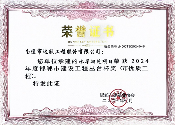 日前,從邯鄲市建筑業(yè)協(xié)會獲悉,水岸瀾苑項目獲邯鄲市2024年度優(yōu)質(zhì)工程---“叢臺杯”工程。