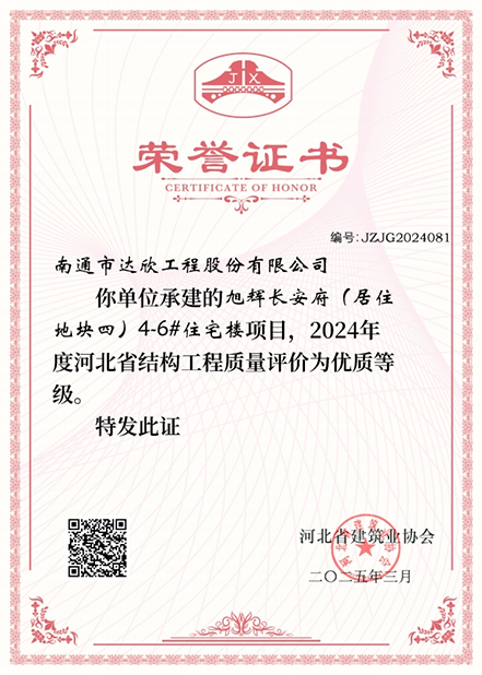 近日,第四工程公司承建的旭輝長安府(居住地塊四)項目憑借卓越的施工質(zhì)量和過硬的工程品質(zhì),在 2024 年度河北省結(jié)構(gòu)工程質(zhì)量評價中脫穎而出,榮獲優(yōu)質(zhì)等級證書。這一殊榮不僅是對項目團隊辛勤付出的高度認可,更是第四工程公司在工程質(zhì)量領(lǐng)域的一次重要突破與里程碑。