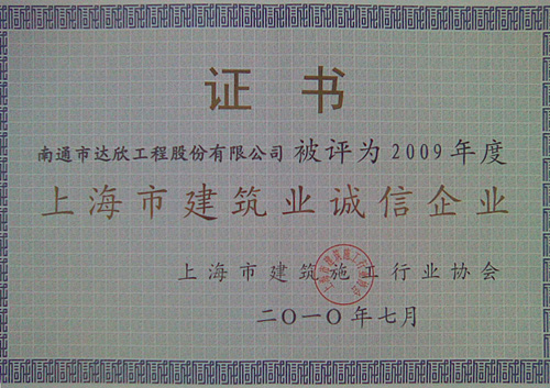 2010年7月30日,2009年度上海市建筑施工企業(yè)綜合實(shí)力及上海市建筑業(yè)誠信企業(yè)頒獎(jiǎng)大會在青松城會議中心召開。出席會議的有上海市建委、上海市建管辦、市場管理總站、施工行業(yè)協(xié)會、各省滬辦領(lǐng)導(dǎo)以及獲獎(jiǎng)企業(yè)共四百多人參加。