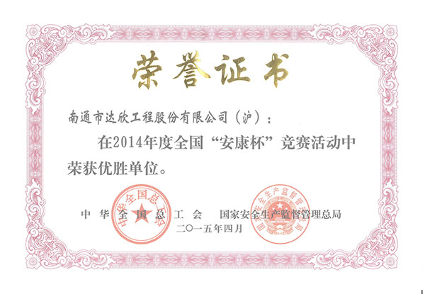 近日,第一工程公司被全國總工會和國家安全生產(chǎn)監(jiān)督管理總局聯(lián)合授予2014年度“全國‘安康杯’競賽優(yōu)勝單位”稱號,這也是公司首次獲此殊榮。